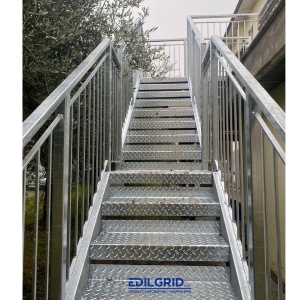 I cosciali delle rampe e dei ballatoi sono realizzati in lamiera presso-piegata, ad essi vengono imbullonati i gradini realizzati in lamiera punzonata oppure in grigliato antitacco con rompivisuale.